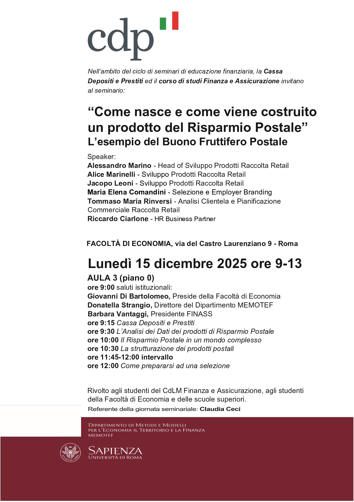 Nell’ambito del ciclo di seminari di educazione finanziaria, la Cassa Depositi e Prestiti ed il Dipartimento MEMOTEF invitano al seminario: