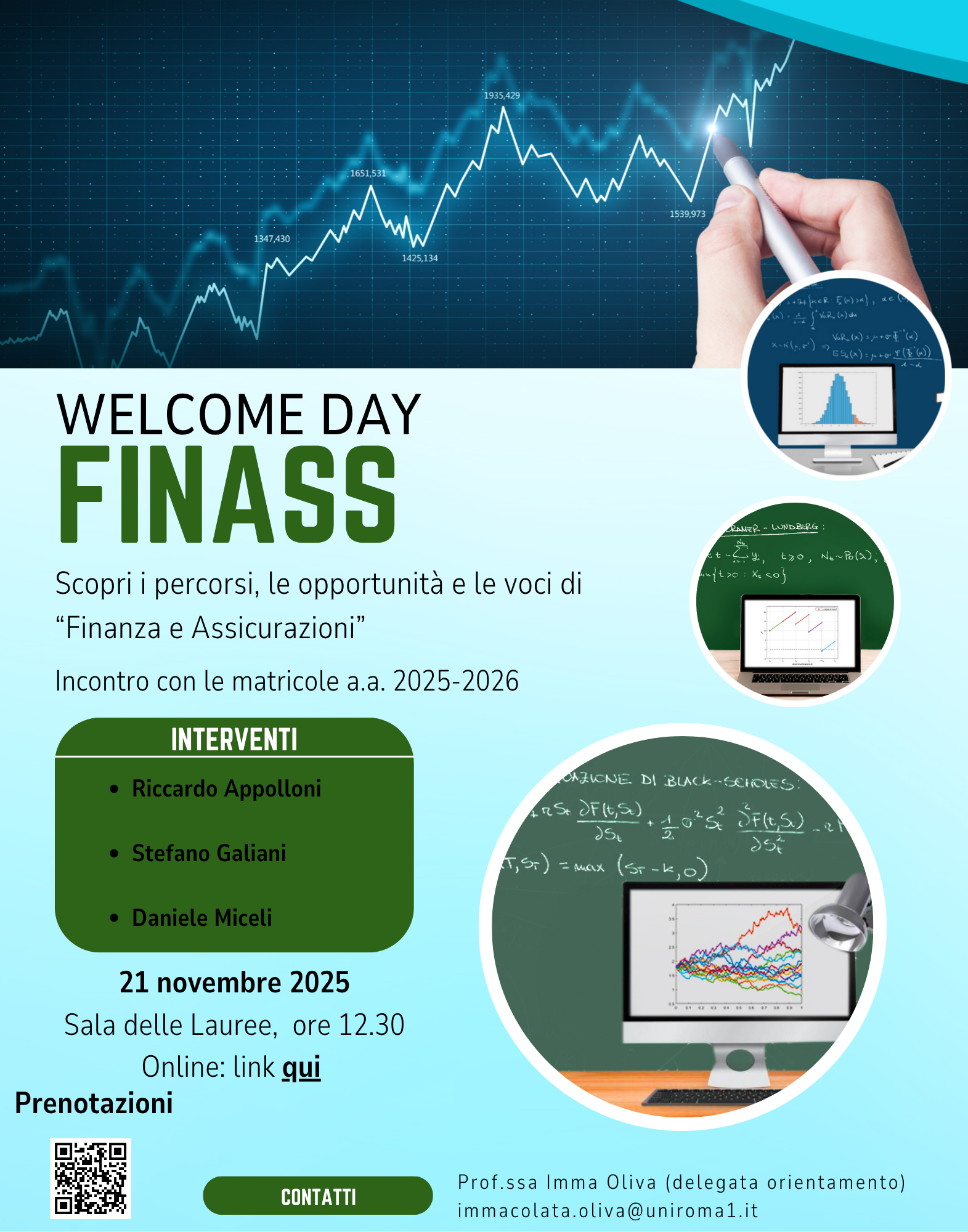Il Corso di Laurea Magistrale in Finanza e Assicurazioni organizza un incontro di orientamento rivolto a tutte le studentesse e a tutti gli studenti triennali interessati a proseguire il proprio percorso formativo in ambito quantitativo. L'evento si terrà giovedì 5 Giugno 2025 alle ore 11 presso l'Aula Acquario (piano terra, Facoltà di Economia, Sapienza università di Roma). La partecipazione è aperta a tutte e a tutti, ma è consigliabile prenotarsi a questo link. Tutti i dettagli sono disponibili alla voce Orientamento e Servizi (pulsante in basso).